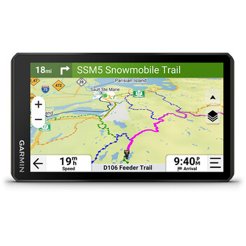 - Navigation sur pistes et virage-à-virage permettant d'explorer des routes non asphaltées, des sentiers et des pistes de motoneige avec les cartes Adventure Roads and Trails.